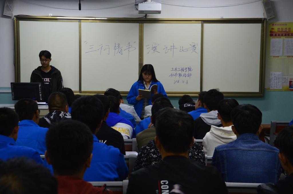 本次演讲大赛以演讲的形式,让同学们说出爱的心声,涉及友情、爱情、亲情等各种发自内心的情感,活动一经发出,就吸引了大量的参赛人员。参赛活动中团总支书记指出“三行情书”活动所要传达的是一种青春正能量,每一幅作品都搭载着深厚的情谊。生活还在继续,让我们继续保持一颗爱人的心,一颗感恩的心。