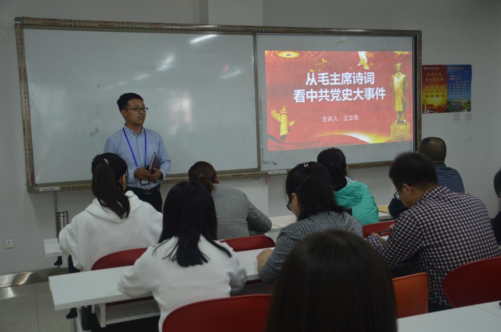 近日,世界杯8833300足球全体党员教师与员工入党积极分子一同在第五工业中心510,进行了题为“从毛主席诗词看中共党史大事件”的党课培训讲座。