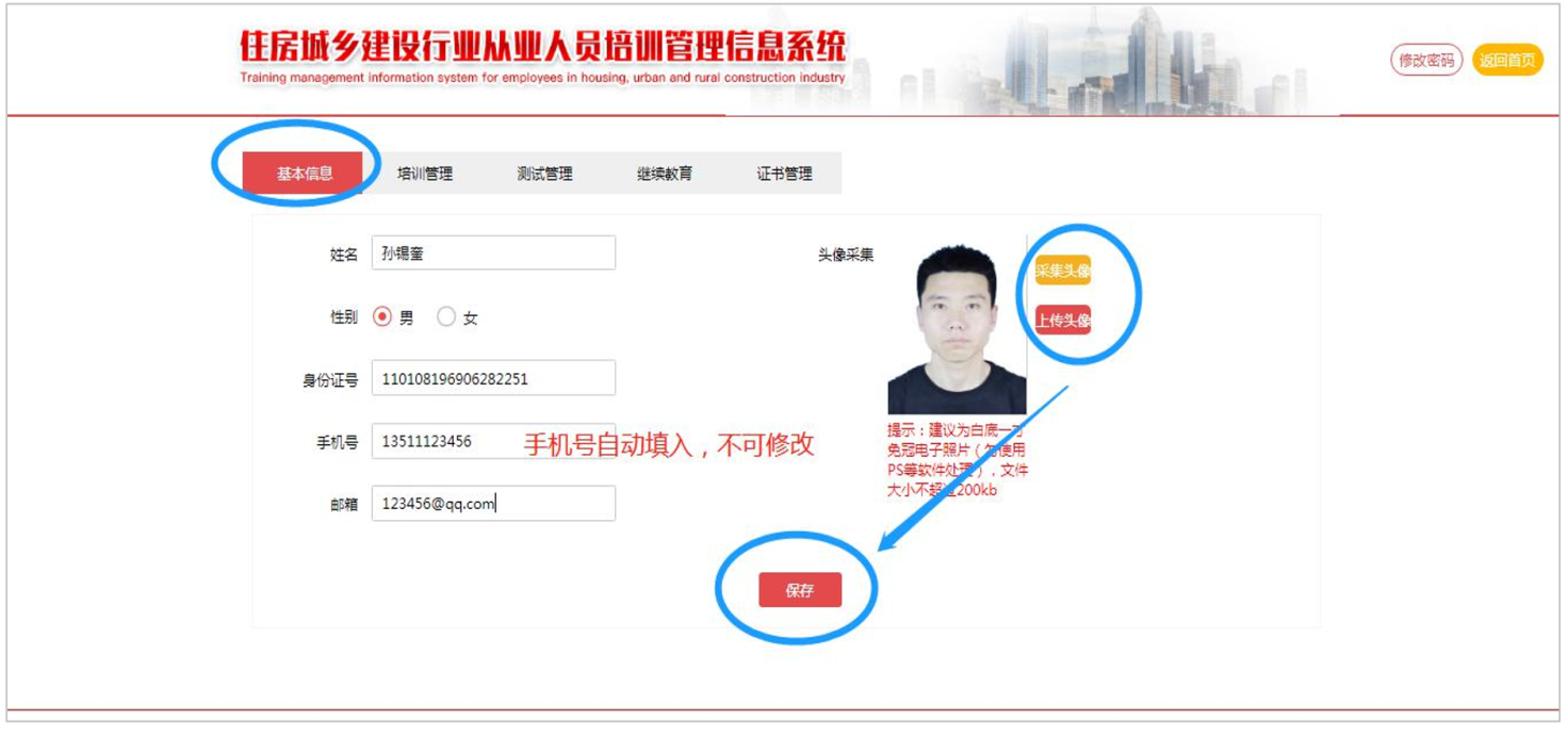 完善头像:在网站首页登陆区输入账号与密码后进入到个人详情页面完成头像上传,根据系统提示,在页面顶部进行头像采集或上传,完成后点击保存。
