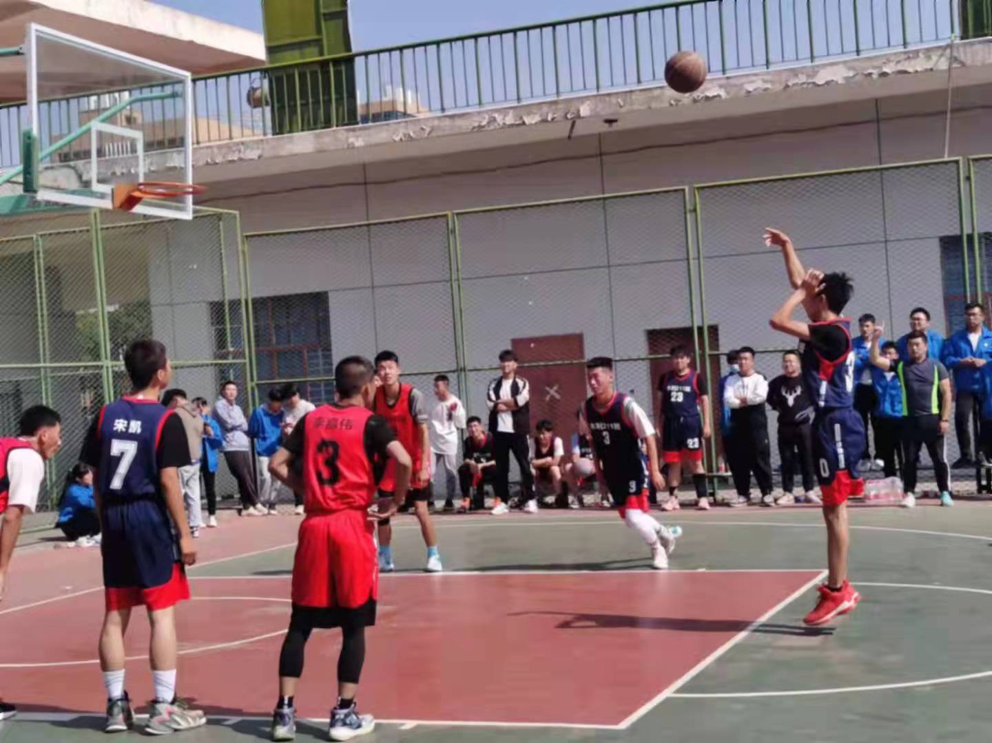 比赛开始的那一刻便点燃了球员们的热情,各种进攻与巧妙的防守让在场的同学忍不住叫好。球员与球员之间配合默契,传球熟练,直逼篮板。在拉拉队员下的呐喊助威下,球场气氛十分活跃。