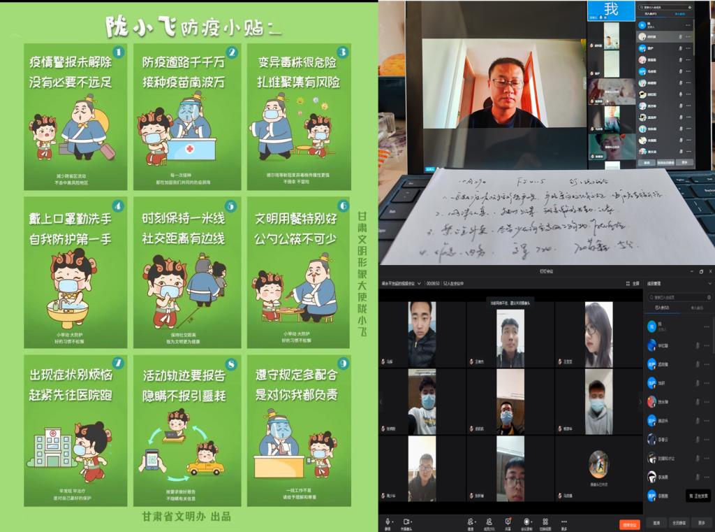 二是组织开展线上“防疫抗疫”心理主题班会。为充分发挥班级心理委员“宣传员”和“好帮手”的作用,切实增强公司员工在新冠肺炎疫情防控期间的心理自助能力,10月25日至30日,公司员工会干部组织各班级心理委员开展线上“防疫抗疫”心理主题班会,2020级、2021级共20个班级参加了此项活动。班级心理委员充分利用QQ群、微信群等媒介,以“陇小飞说防疫”之防疫小贴士文字、图片、视频、PPT等形式,采用提问、竞答、讨论、演讲等方法,围绕“在疫情防控期间保持良好心态”、“老员工学习时间与网游时间如何分配”、“致敬逆行者”、“今天防疫我在行动”等话题开展了丰富多彩的班会活动。