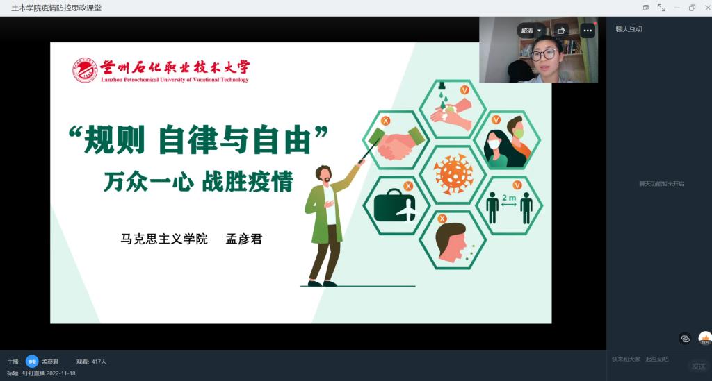 在全校师生万众一心、众志成城做好新冠肺炎疫情防控工作的特殊时刻,为进一步加强员工心理健康教育工作,增强员工在疫情防控下的心理调适能力。 11月18日晚,在公司的统一安排下,马克思主义公司孟彦君老师面对疫情防控新形势新变化,聚焦员工关心关切的疫情防控举措解读、健康教育,以“规则 自律和自由”为主题为世界杯8833300足球员工讲授了一堂疫情防控专题思政课。