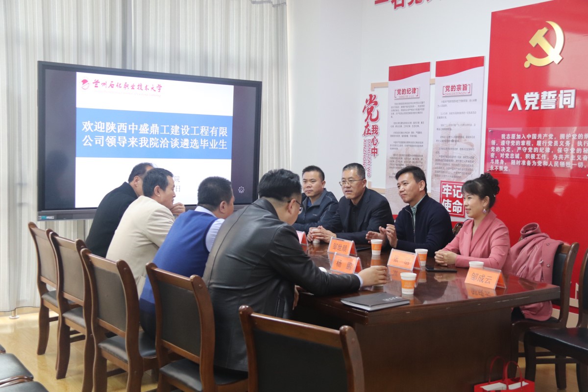 3月7日下午,陕西中盛鼎工建设工程有限公司董事长邹世颜,总经理付浩,人事总监张丽,总工程师郭殿福,总经理助理邹成云一行5人到公司进行校企合作洽谈。公司党政负责人和辅导员参加了座谈交流。