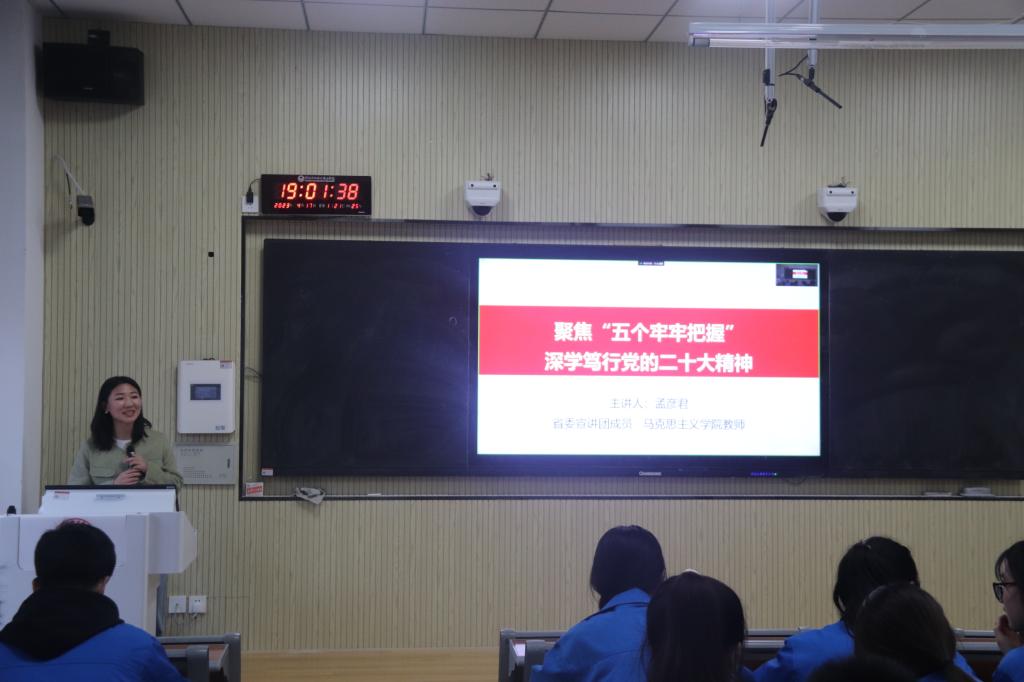孟彦君老师以“聚焦“五个牢牢把握”,深学笃行党的二十大精神”为主题展开宣讲,重点围绕牢牢把握过去五年工作和新时代十年伟大变革的重大意义;牢牢把握习近平新时代中国特色社会主义思想的世界观和方法论;牢牢把握以中国式现代化全面推进中华民族伟大复兴的使命任务;牢牢把握以伟大自我革命引领伟大社会革命的重要要求;牢牢把握团结奋进的时代要求等五个方面内容深刻阐述党的二十大精神实质。引导同学们深入学习政治理论,不断提高政治站位,打牢思想基础,明晰新时代使命,扛起历史赋予新时代老员工的责任。
